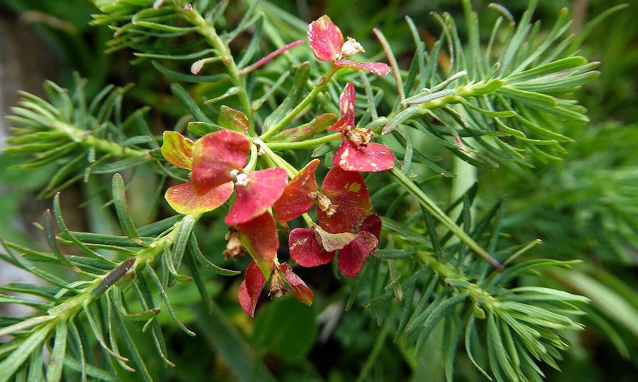 Las hojas de la Euphorbia cyparissias son largas, estrechas y lineales, similares en forma a las agujas de un ciprés, de ahí su nombre común. Durante la temporada de crecimiento, estas hojas presentan un vibrante color verde esmeralda que se transforma en un llamativo rojo vivo en otoño, proporcionando un espectáculo visual en el jardín.
